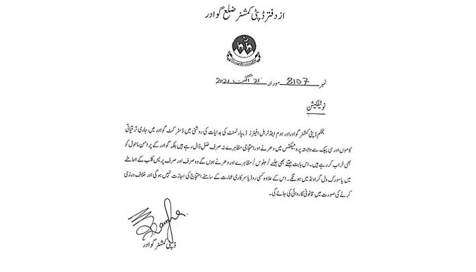 ہفتے کے روز جاری کیے گئے ڈپٹی کمشنر گوادر کے حکم میں کہا گیا ہے کہ ڈپٹی کمشنر اور ہوم اینڈ ٹرائبل افیئرز ڈیپارٹمنٹ کی ہدایات کی روشنی میں ڈسٹرکٹ گوادر میں جاری ترقیاتی کاموں اور سی پیک سے وابستہ پروجیکٹس میں دھرنے اور احتجاجی مظاہرے نہ صرف خلل ڈال رہے ہیں بلکہ گوادر کے پر امن ماحول کو بھی خراب کر رہے ہیں۔