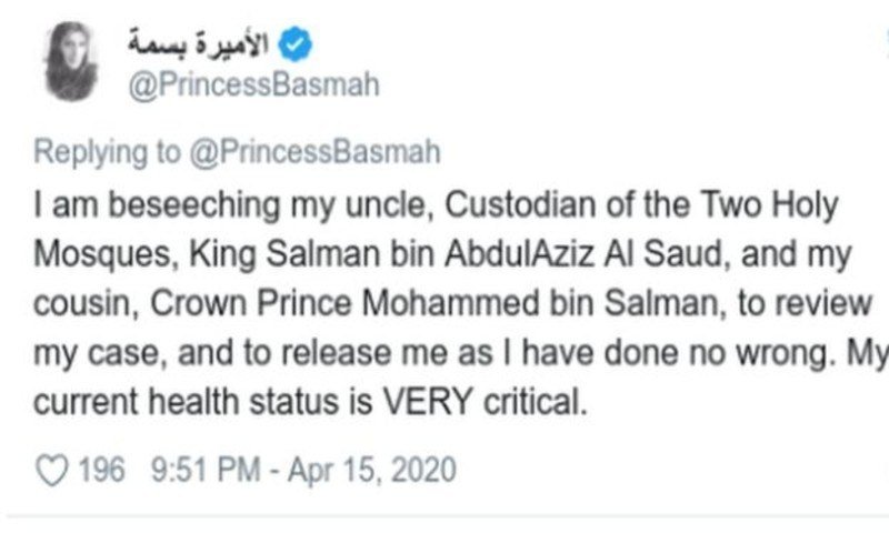 برطانوی اخبار دی گارجین کے مطابق پراسرار طور پر لاپتہ ہوجانے والی 56 سالہ شہزادی بسمہ بنت سعود نے اپنی ٹوئٹ میں سعودی عرب کے فرماں رواں اور ولی عہد سے مدد کی اپیل کرتے ہوئے دعویٰ کیا کہ قید میں رہنے کی وجہ سے ان کی طبیعت خراب ہوگئی ہے۔