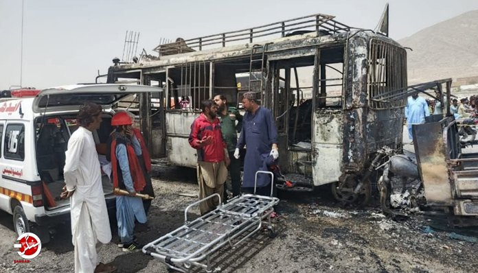 اطلاعات کے مطابق کوئٹہ مغربی بائی پاس کلی رئیسانی کے مقام پر پیٹرول سے لوڈ زرنج رکشہ اور نواں کلی لوکل بس کے درمیان تصادم کے نتیجے میں بس میں آگ لگ گئی جس کے باعث جانی نقصان ہوا۔