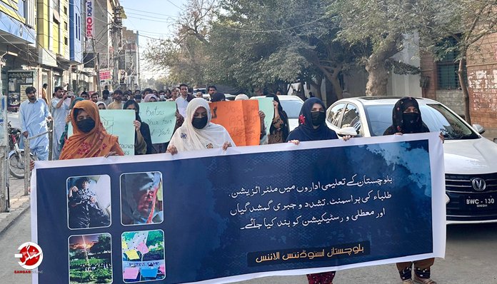 بلوچستان اسٹوڈنٹس الائنس کی جانب سے تعلیمی اداروں کی ملٹرائیزیشن،لسبیلہ اور خضدار انجینئرنگ یونیورسٹی میں طلباء کی مختلف طریقے سے جاری ہراسمنٹ سمیت طلباء کی معطلی اور تشدد و گرفتاری کیخلاف ملک گیر احتجاجی سلسہ جاری رہا۔