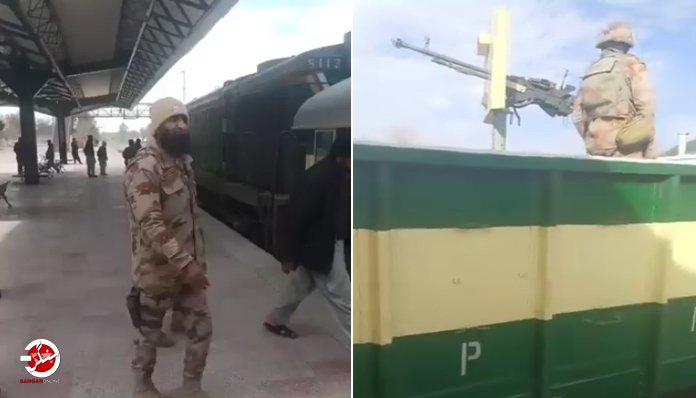 عسکری اسٹیبلشمنٹ کی ایما پر پاکستان کی وفاقی بشمول بلوچستان حکومت کی جانب سے پہلی فرست میں جعفر ایکسپریس کو مشین گنز اورجدید سینسرز سے لیس کردیا گیا ہے جس کی ویڈیو سوشل میڈیا پر سرکولیٹ کر رہی ہے جس میں دیکھا جاسکتا ہے کہ پلیٹ فارم پر موجود جعفر ایکسپریس روانگی سے قبل اس کی ایک بوگی کے اوپری حصے میں سیکورٹی اہلکار مشین گنوں کے ساتھ دکھائی دے رہے ہیں ۔