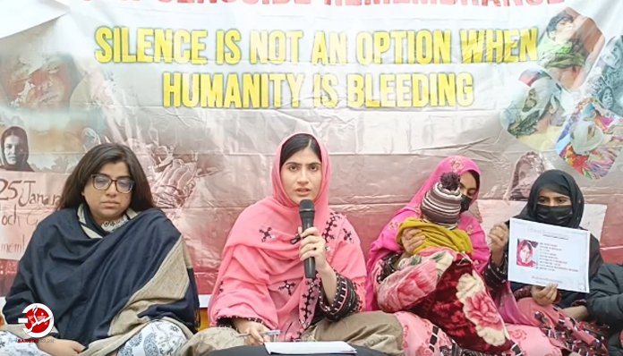انہوں نے کہا کہ اس کے ساتھ ساتھ آج کے دن کا انتخاب اس لیے کیا گیا کیونکہ بی وائی سی پچیس دسمبر کو بلوچ جینوسائڈ کا یادگاری دن سے متعارف کرچکی ہے۔ اس دن کو چودہ سال قبل توتک میں بلوچ فرزندوں کی اجتماعی قبریں ڈیتھ اسکواڈ کے کیمپوں سے دریافت ہوئیں، جن کی نہ ہی کوئی تفتیش کرائی گئی اور نہ ہی ان کی شناخت کرانے کی کوشش کی گئی۔بلوچستان میں پچھلے کئی سالوں سے نہ صرف جبری گمشدگیاں متواتر جاری ہیں بلکہ ان جبری گمشدہ افراد کی کبھی مسخ شدہ لاشیں پھینکی گئیں، تو کبھی ڈرل کی گئی یا تیزاب میں ڈوبی ہوئی لاشیں پھینکی گئیں۔ کبھی ہیلی کاپٹروں سے لاشیں پھینکی گئیں، تو کبھی اجتماعی قبروں میں لاشیں دفنائی گئیں، اور کبھی اسپتالوں میں لاوارث قرار دے کر پھینکی گئیں، اور خیراتی اداروں کے ہاتھوں قبرستانوں میں نامعلوم طور پر دفنایا گیا۔