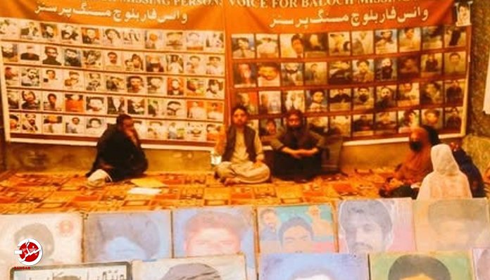 بلوچستان میں جبری گمشدگیوں کےخلاف وائس فار بلوچ مسنگ پرسنز ( وی بی ایم پی ) کے زیر اہتمام قائم احتجاجی کیمپ کو آج بروز پیر تنظیم کے چیئرمین نصراللہ بلوچ کے قیادت میں کوئٹہ پریس کلب کےسامنے 6094 دن مکمل ہوگئے۔