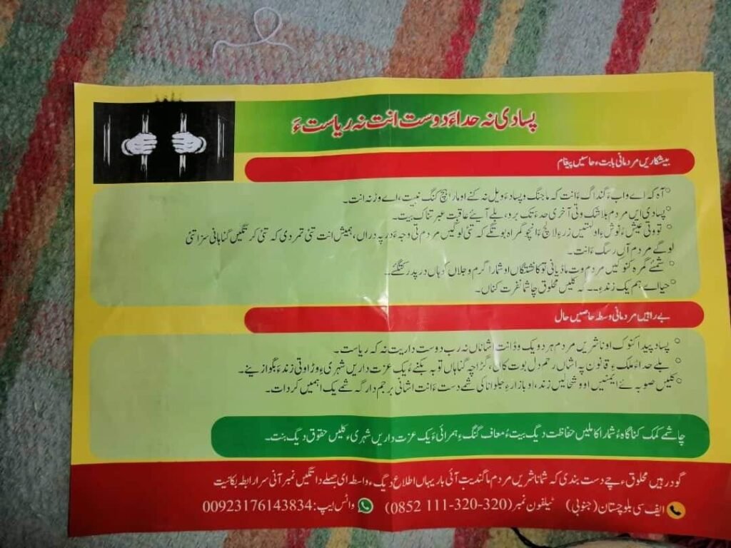 ڈاکٹر اللہ نذر بلوچ نے کہا کہ ایسی پمفلٹ بازی قابض اور نوآبادی طاقتوں کی جانب سے ایک حربہ ہے۔ وہ عام عوام پر مظالم ڈھاکر اسے راست ثابت کرنے کی کوشش کرتے ہیں لیکن بلوچ قوم پاکستان کا اصل چہرے اورنجات کی منزل سے واقف ہوچکا ہے۔ اس عظیم قوم کو کسی بھی قیمت پر اپنے منزل سے بھٹکایا نہیں جاسکتاہے۔